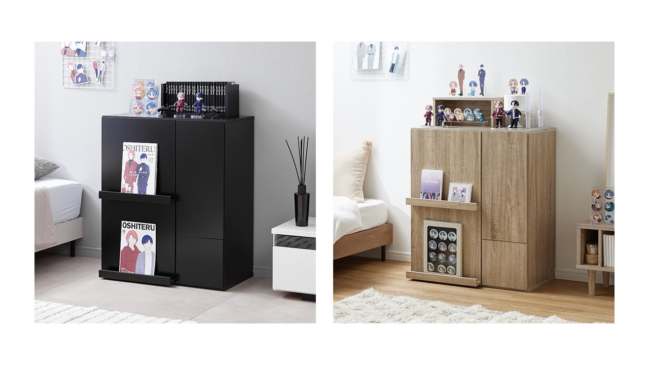 お気に入りのグッズを美しくディスプレイできる一方で、生活感の出やすいアイテムは扉内にすっきり収納可能で、限られた空間でも“推し”と心地よく暮らせる設計が特長です。